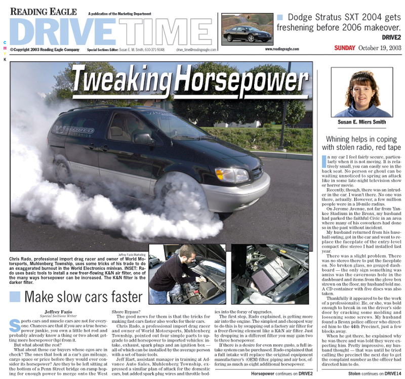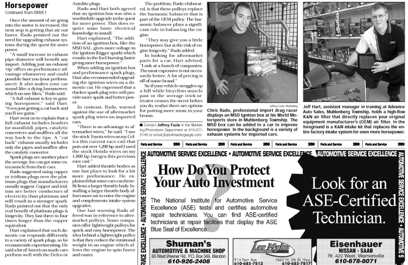 Publications: Reading Eagle DriveTime: Articles These articles were written for the Reading Eagle newspaper. While I worked for the newspaper, I wrote a monthly column for the DriveTime section, but on occasion I would also write feature articles for DriveTime. You can read the articles below. You can view the entire articles by clicking the titles below or you can view full-page image of the original newspaper page by clicking the thumbnail image.