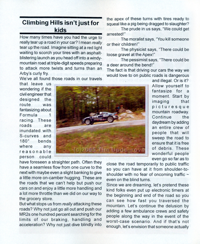 These articles were written for Trip Notes that is published by Club MR2. There was a period of my life that I was incredibly active in the national (and even international) Toyota MR2 scene. During this time, my adventures in automobile racing were documented in a wide array of publications.