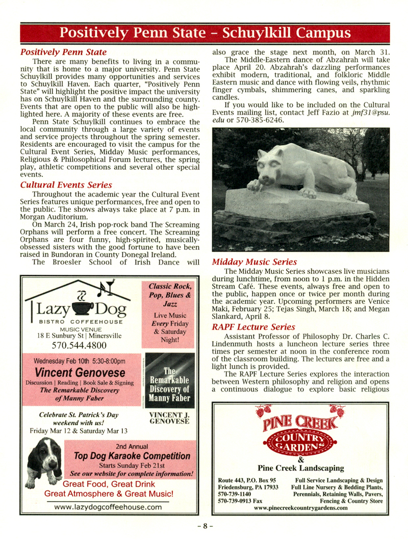 These articles were written for Haven Highlights newsletter that is published quarterly by the borough of Schuylkill Haven, PA. Penn State Schuylkill is located in Schuylkill Haven, PA. In October of 2009 I started writing these articles entitled "Positively Penn State" to emphasize the positive effects the campus has on the town.