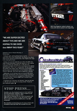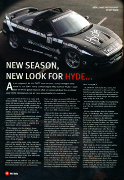 Publications: MR2 Only Magazine This article was written for MR2 Only magazine and was published in the June/July 2007 issue. The article detailed the latest modifications and plans for the Toyota MR2 known as "Hyde." The idea for Hyde was conceived by me back in 2000 and the 2007 racing season was the culmination of that dream. You can read the article by clicking the pages below to see a full-sized version of the page. You can read more about Hyde and my experience as owner/driver of Jekyl Hyde Racing at www.jekylhyderacing.com.